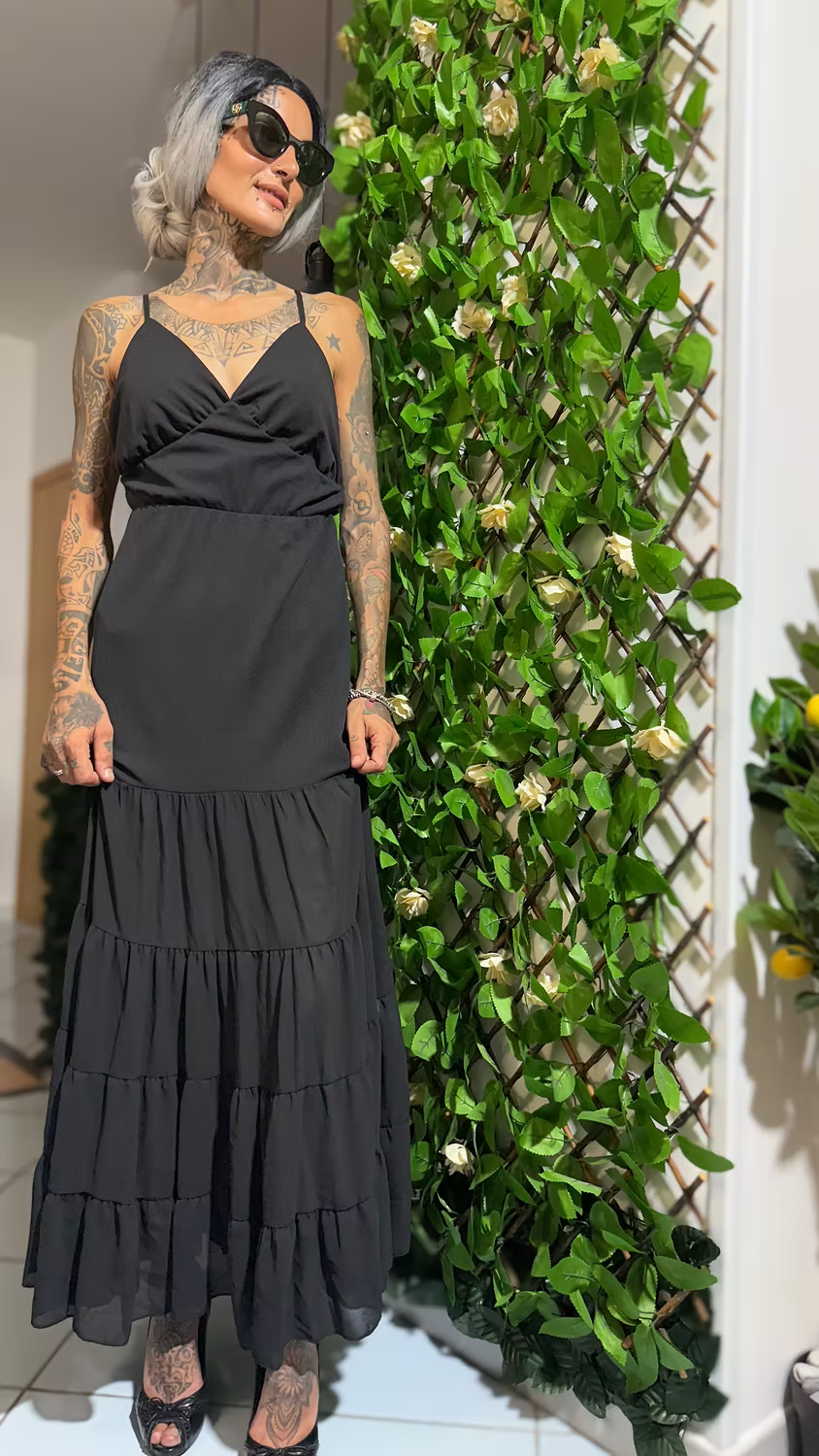 La schiena resta scoperta e porta dei bottoncini in tessuto a chiusura.