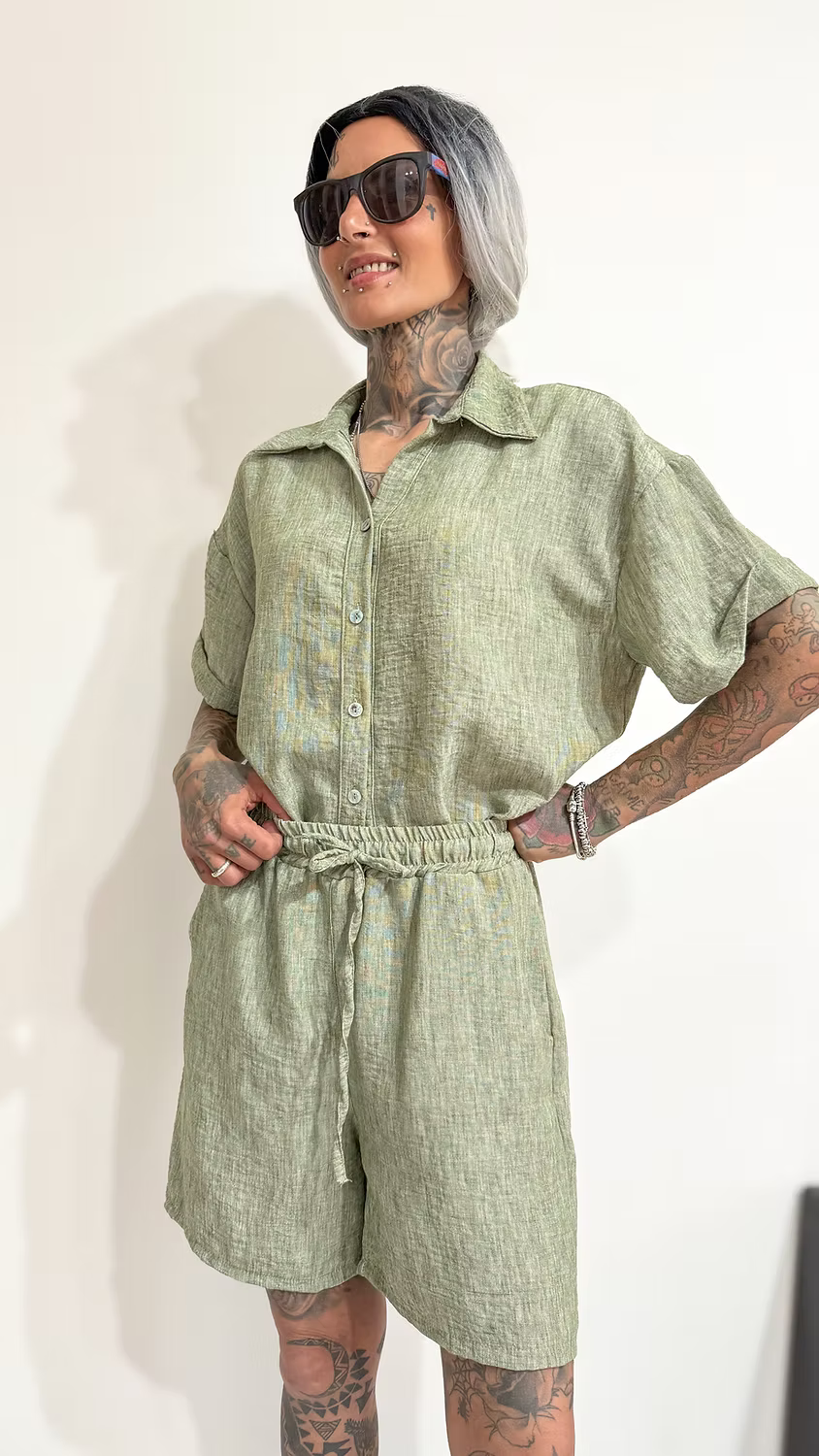 Coordinato composto da pantaloni a palazzo con elastico in vita e maglietta a mezza manica. Comodo ed elastico.