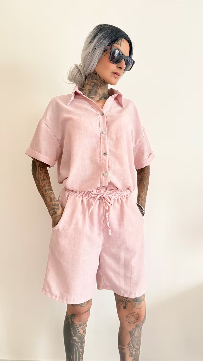 Coordinato composto da pantaloni a palazzo con elastico in vita e maglietta a mezza manica. Comodo ed elastico.