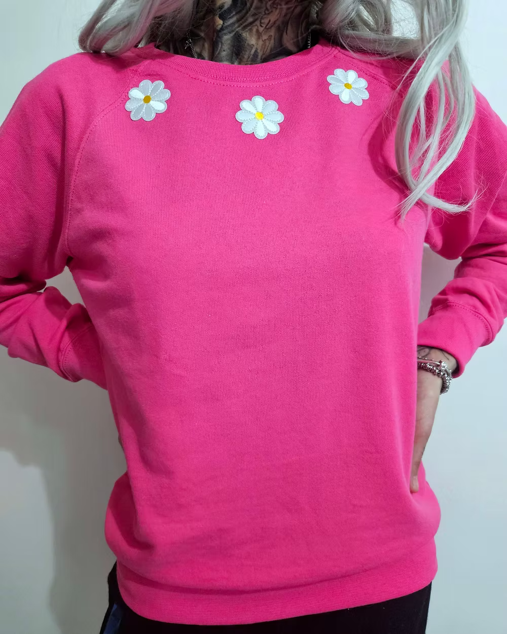 Felpa garzata fucsia con margherite sul collo. Taglia unica, veste massimo fino ad M.