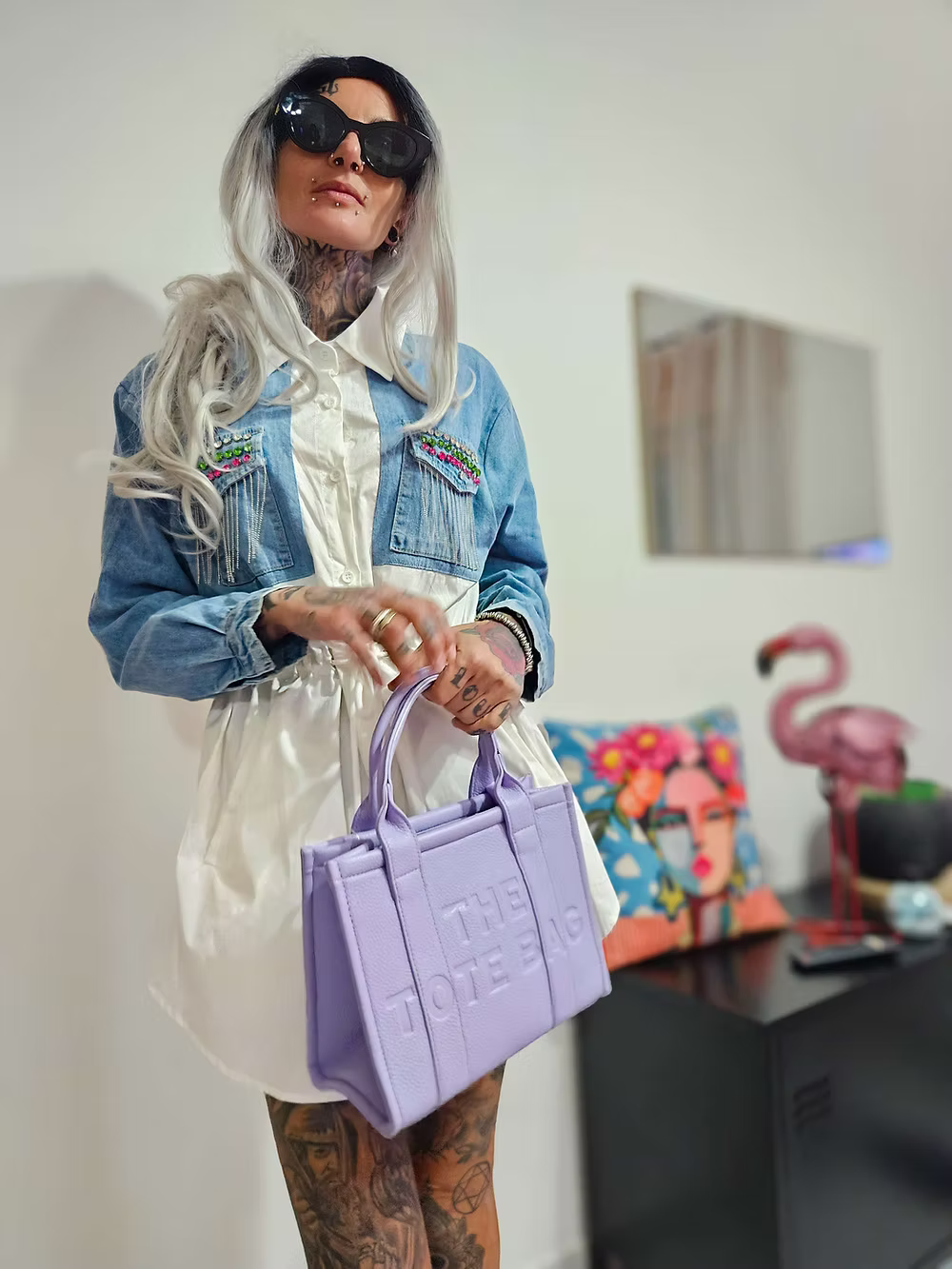 Camicia con inserti in denim e pietre colorate.