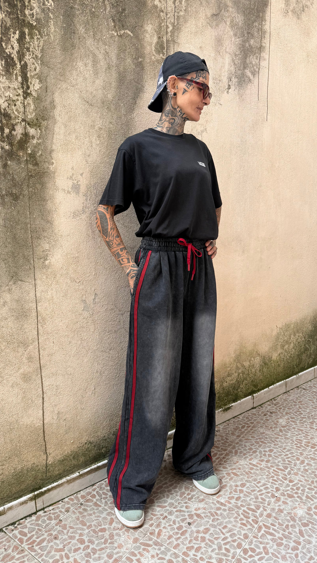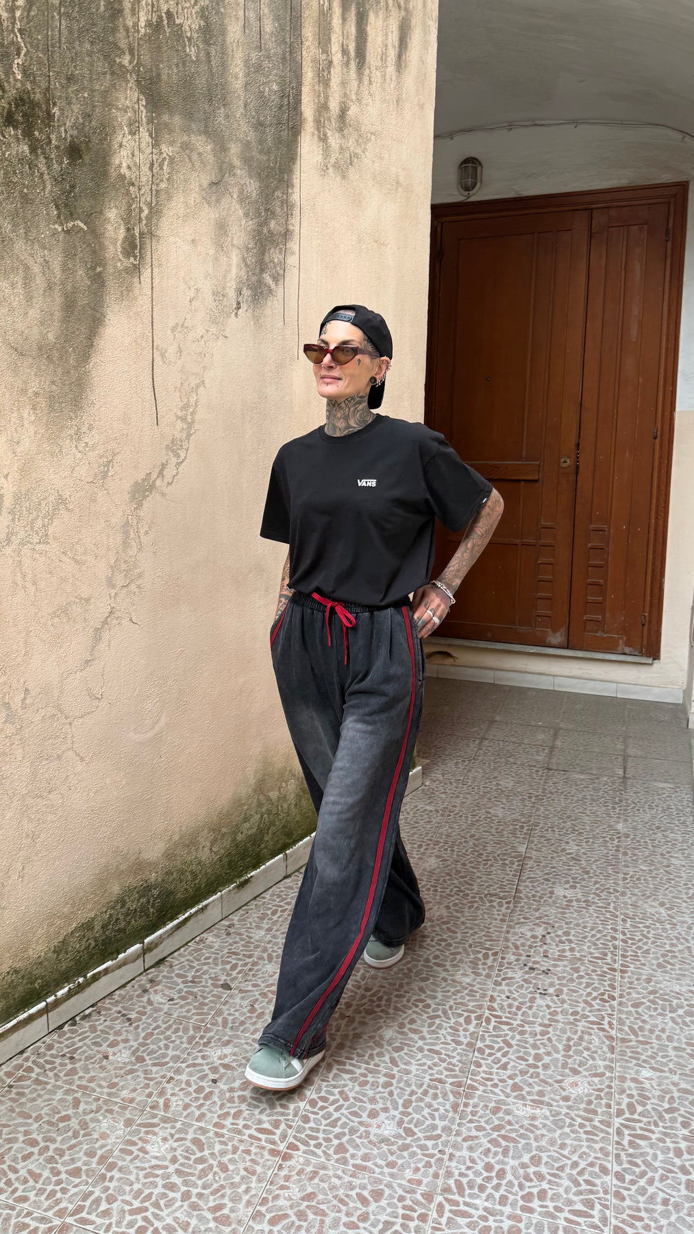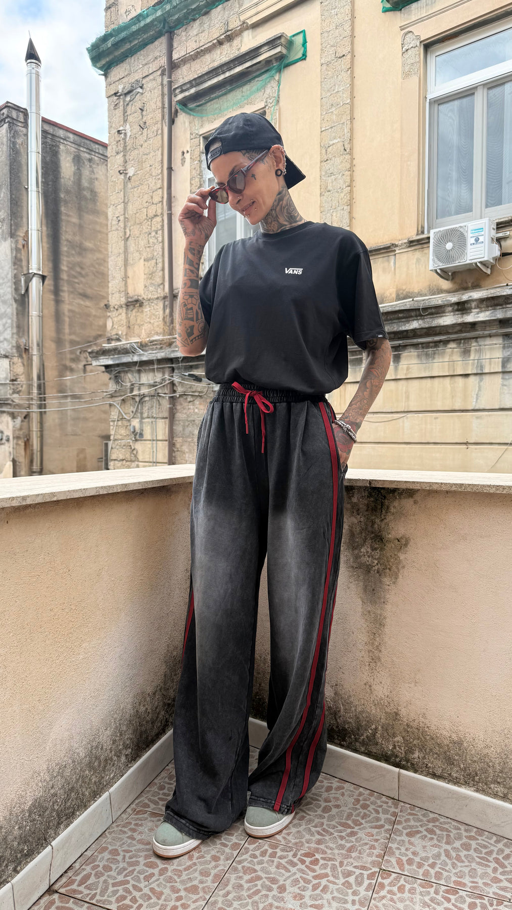 Pantaloni jogger in cotone effetto washed con banda laterale bordeaux e coulisse rossa in vita. Vestibilità morbida, vita elasticizzata e tasche laterali. Ideali per un look casual e street.
