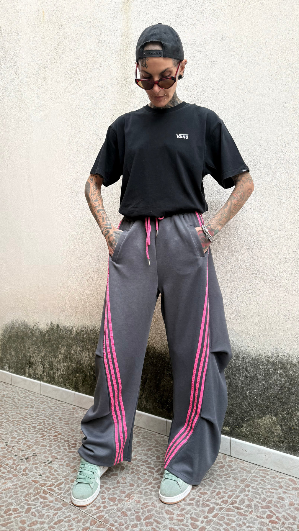 Pantaloni jogger in felpa grigio antracite con vestibilità ampia modello balloon, elastico in vita e laccio fucsia. Dettaglio di bande laterali rosa fluo per un look sporty e grintoso.